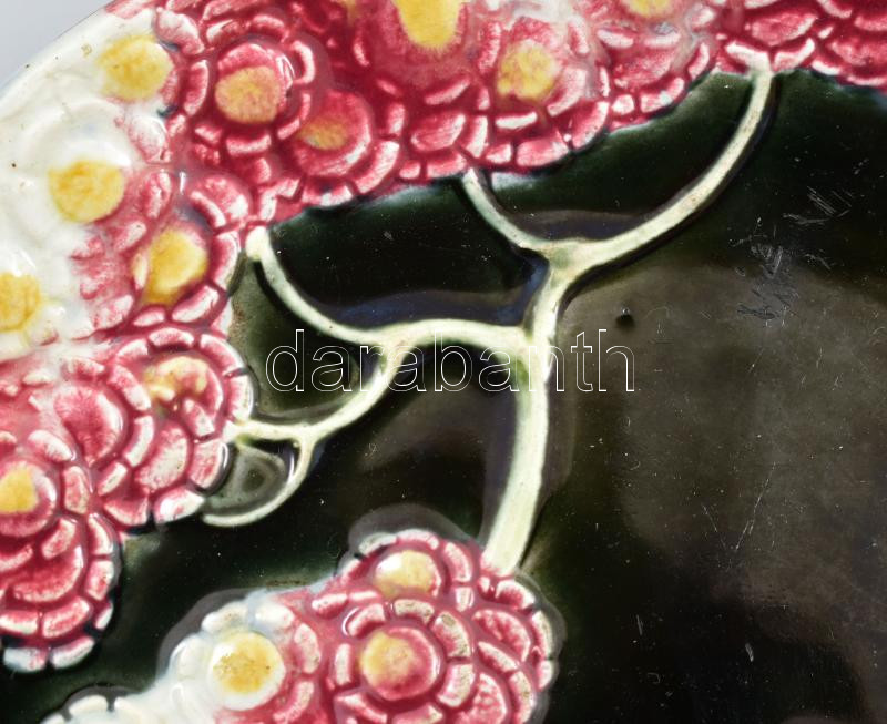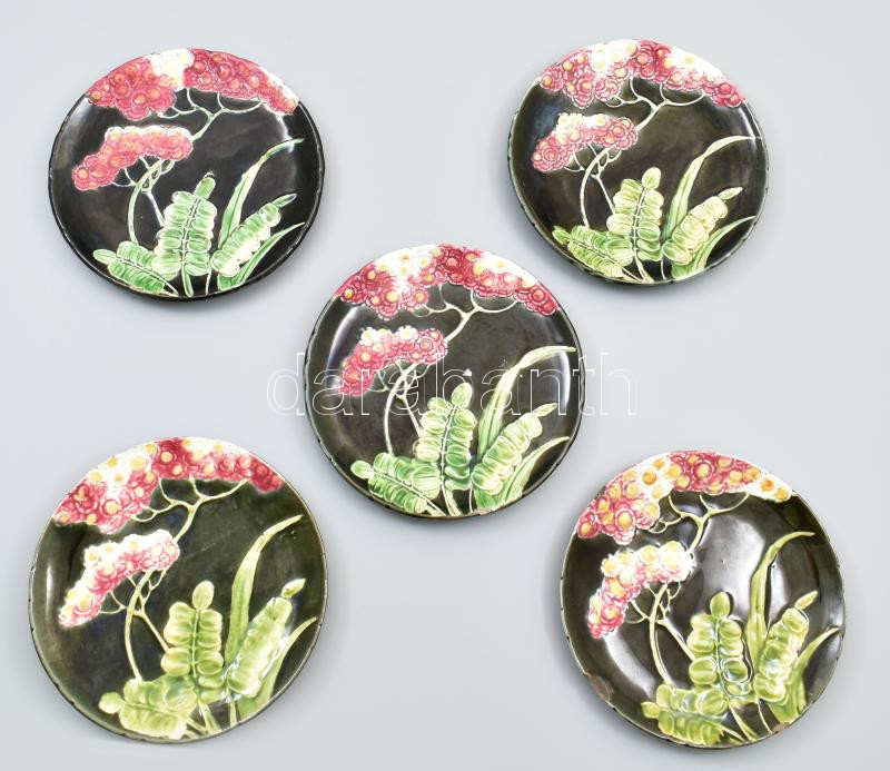 Leírás: Schütz Cilli stílusú szecessziós virágos tányér garnitúra, jelzés nélkül, sérülésekkel, 5 darab, d: 17,5 cm