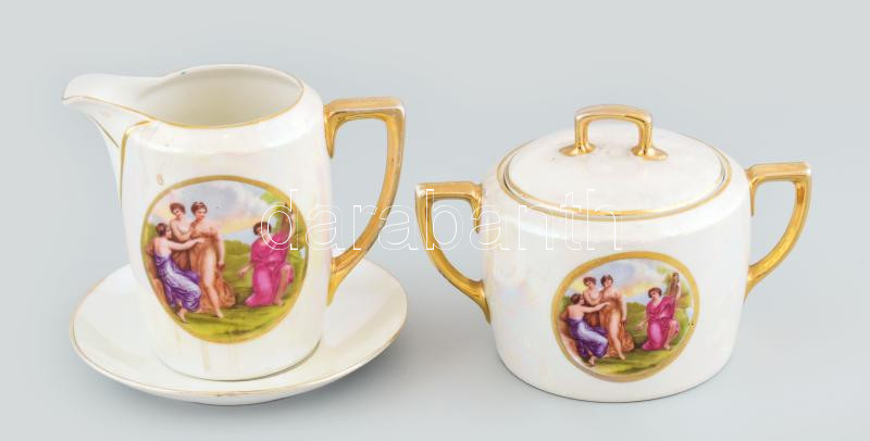 Leírás: Cseh Alt Wien porcelán kiöntő, cukordoboz, alátét. Matricás, jelzett, minimális kopással