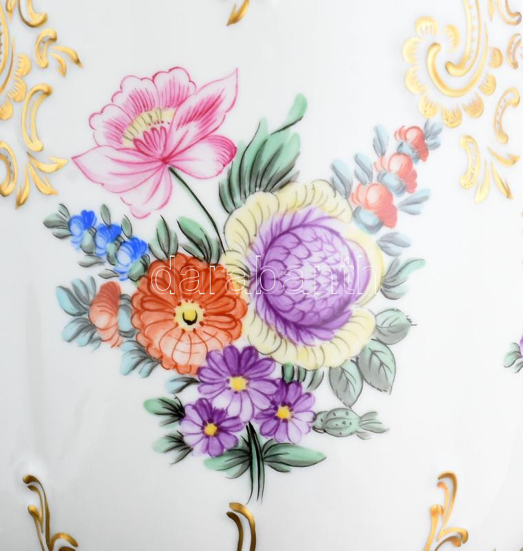 Leírás: Hollóházi nagy kaspó. Kézzel festett, jelzett, aranyozott, kis kopással d: 17 cm, m: 16 cm