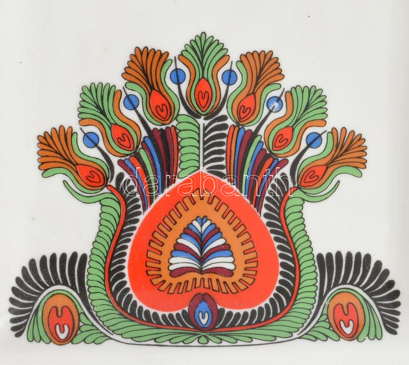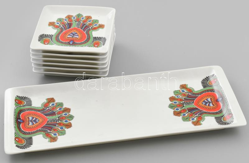 Leírás: Hollóházi népi mintás süteményes készlet. Hat személyes. Matricás, jelzett, hibátlan tálca 38 cm, tányér 13 cm
