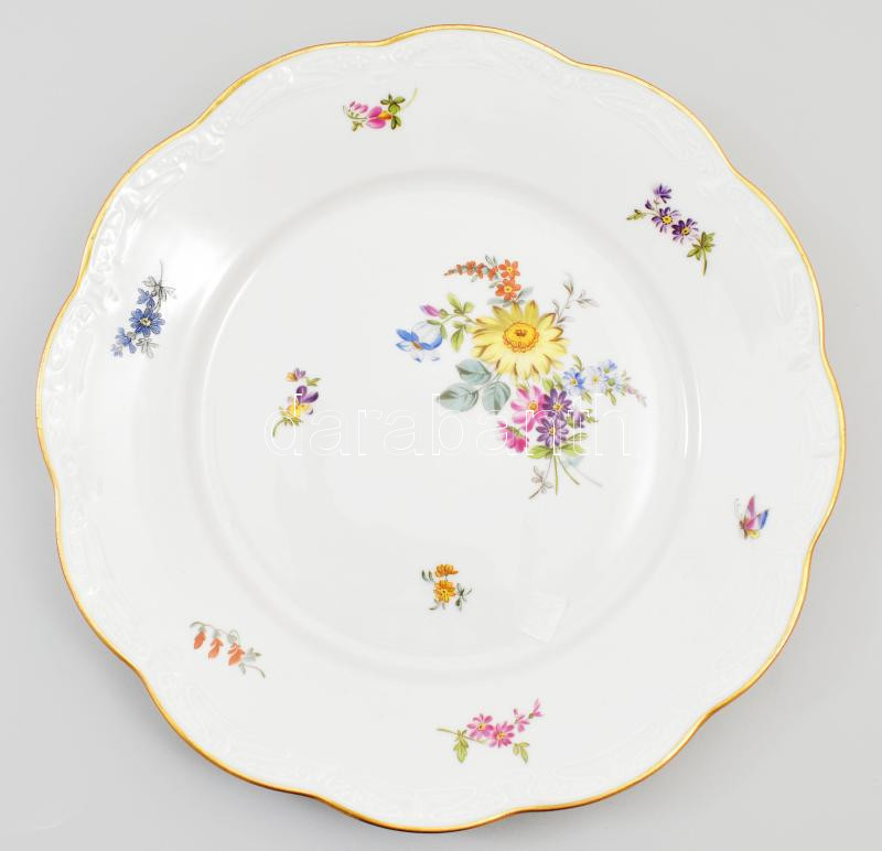 Leírás: Hüttl Tivadar Budapest virágmintás tányér, pereménél körbefutó dombormintával, aranyozással, kézzel festett, minimális kopottsággal, d: 25,5 cm
