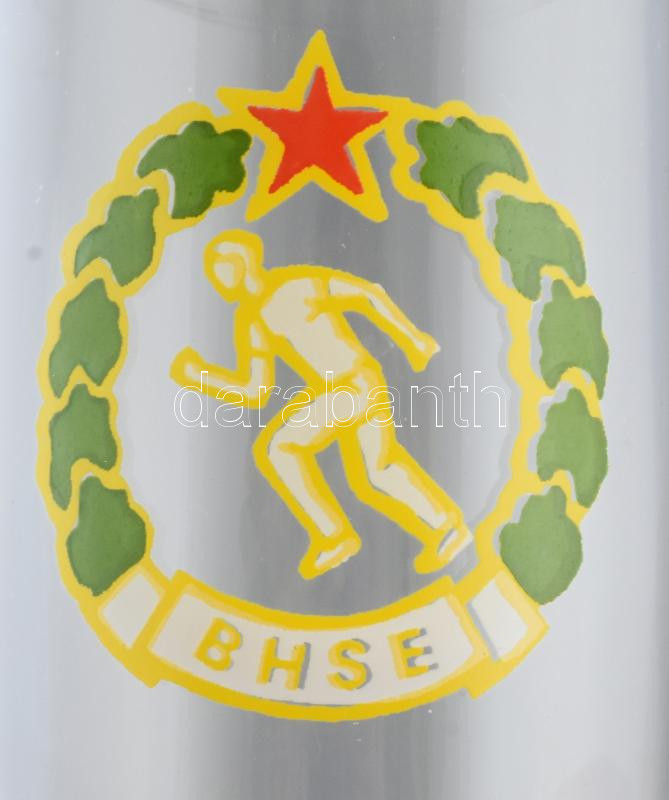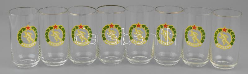 Leírás: B[udapesti] H[onvéd] S[port] E[gyesület] üvegpoharak, matricás, m: 12 cm, apró kopásnyomokkal, 8 db