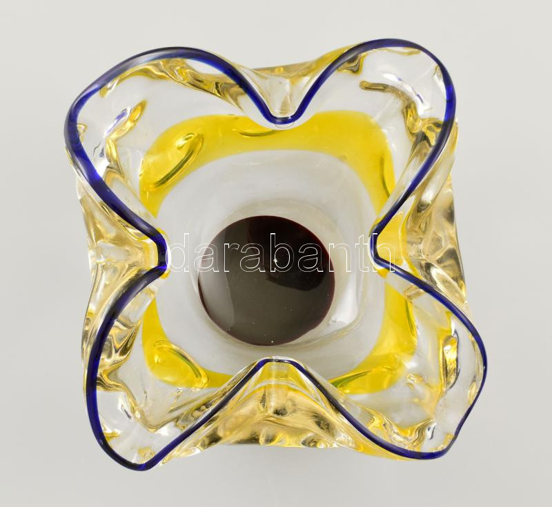 Leírás: Csehszlovák üveg kínáló, anyagában színezett vastag üveg, kis kopással, jelzés nélkül, d: 21 cm, m: 9 cm
