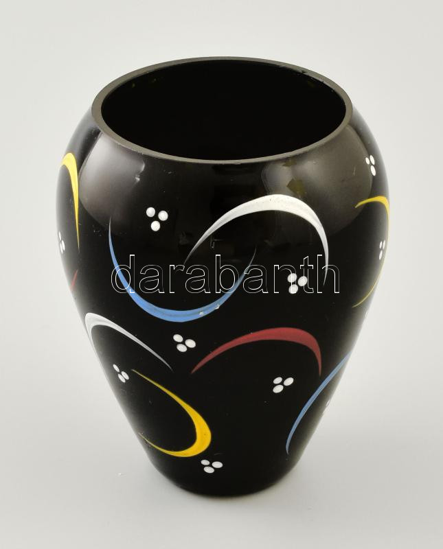 Leírás: Német retro hialitüveg váza, kézzel festett, jelzés nélkül, kis kopással, m: 11 cm