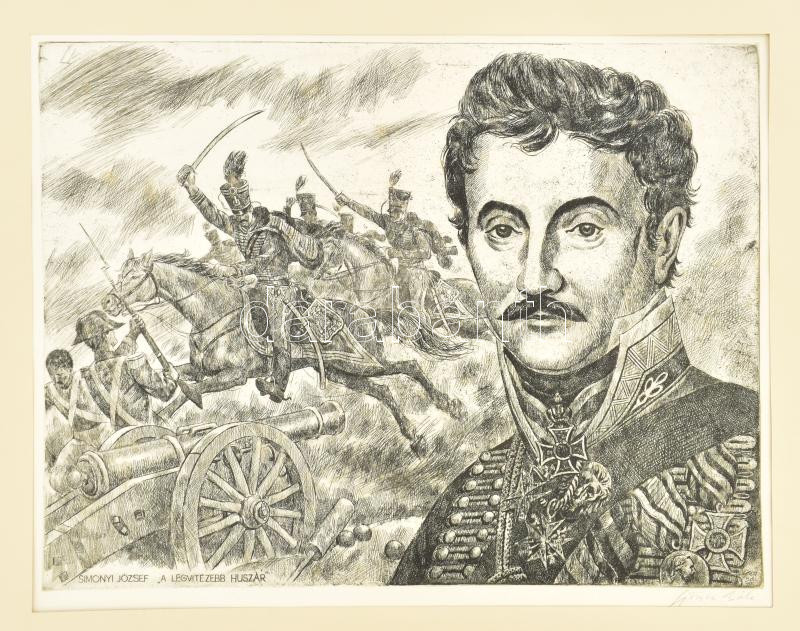 Gönczi Béla (1934-): Simonyi József, "a legvitézebb huszár". Rézkarc, ... https://www.darabanth.com/hu/443-Gyorsarveres/443.0/Festmenyek-es-grafikak/Festmenyek-es-grafikak~500001/Gonczi-Bela-1934-Simonyi-Jozsef-a-legvitezebb-huszar-Rezkarc-papir-jelzett-Paszpar~II2915554