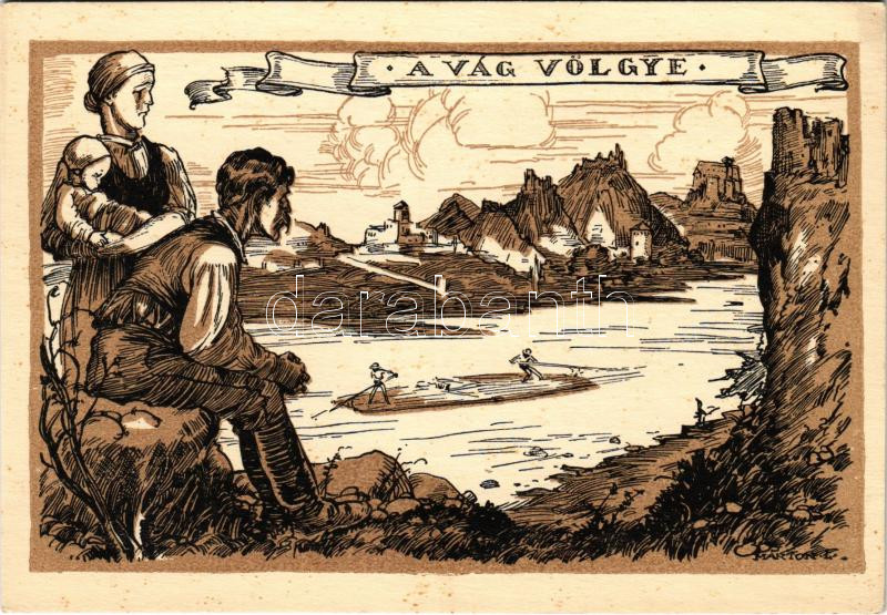 Vágvölgy, Váh Valley, Povazie; A Vág völgye, vize fája magyar vágya, tutajos cserkészek. Kiadja a Magyar Nemzeti Szövetség, Hornyánszky Viktor rt. / Hungarian irredenta propaganda art postcard from Váh river, scouts rafting s: Márton L. (fl)