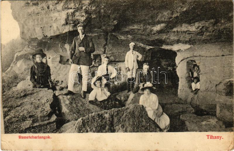 1910 Tihany, Remetebarlangok, kirándulók (EK) https://www.darabanth.com/hu/443-Gyorsarveres/443.0/Kepeslapok/Magyarorszag~2000005/1910-Tihany-Remetebarlangok-kirandulok-EK~II2920928