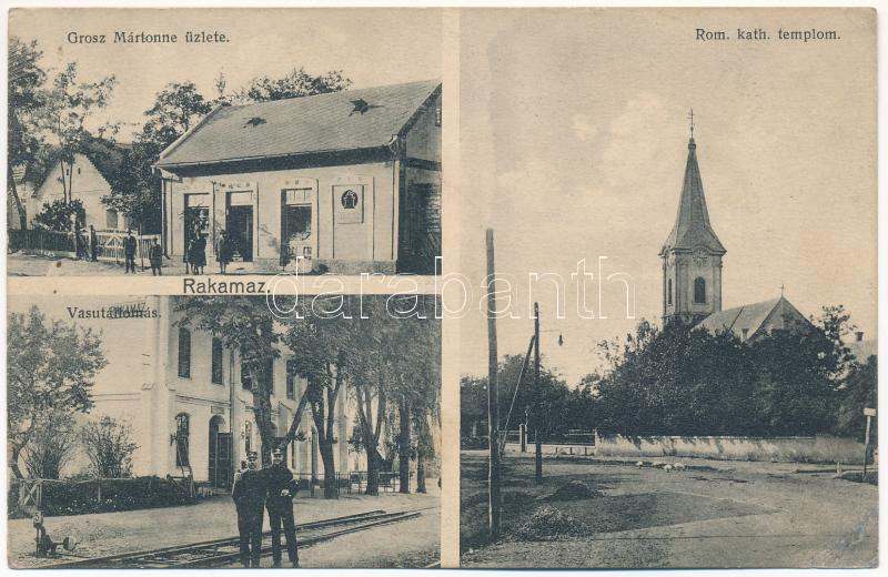 Leírás: Rakamaz, Római katolikus templom, vasútállomás, Grosz Mártonné üzlete (r)