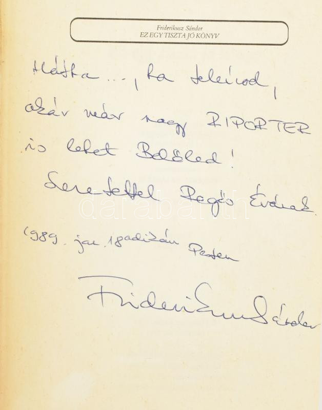 Friderikusz Sándor: Ez egy tiszta jó könyv. DEDIKÁLT! [Debrecen], 1988... https://www.darabanth.com/hu/443-Gyorsarveres/443.0/Konyvek/Konyvek-Egyeb-ritkasagok~1000029/Friderikusz-Sandor-Ez-egy-tiszta-jo-konyv-DEDIKALT-Debrecen-1988-Alfoldi-ny-Kiadoi-p~II2922571