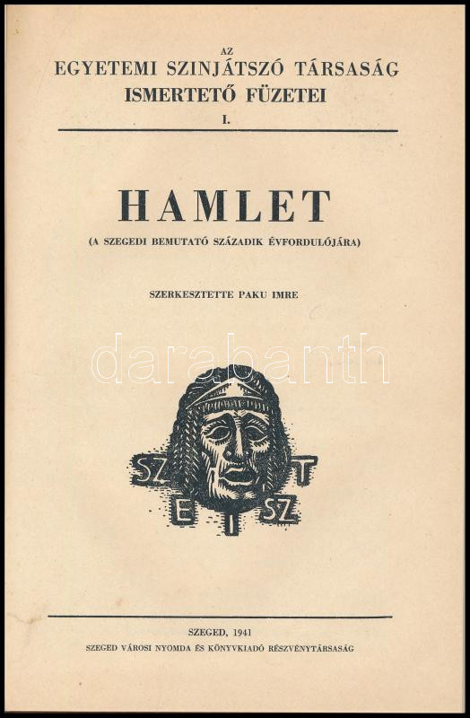 Hamlet. (A szegedi bemutató századik évfordulójára). Szerk.: Paku Imre. Szent-Györgyi Albert előszavával. Az Egyetemi Színjátszó Társaság ismertető füzetei 1. Szeged, 1941, Városi Nyomda és Könyvkiadó Rt., 73 p. + 4 (kétoldalas) t. Fekete-fehér fotókkal, hirdetésekkel. Átkötött műbőr-kötésben.