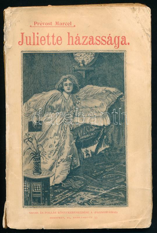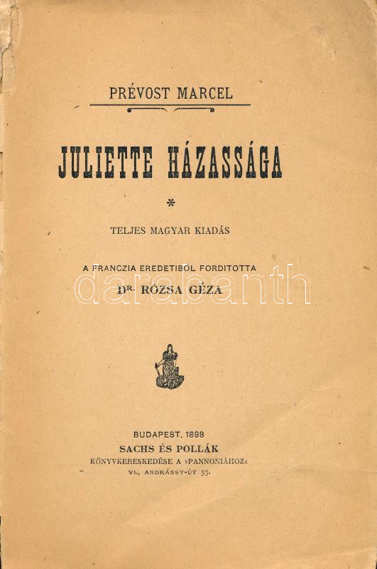 Prévost, Marcel: Juliette házassága. Ford.: Dr. Rózsa Géza. Bp., 1898, Sachs és Pollák Könyvkereskedése a "Pannoniához" (Márkus Samu-ny.), 112 p. Első magyar nyelvű kiadás. Kiadói illusztrált papírkötés, sérült borítóval és gerinccel, sérült lapszélekkel.