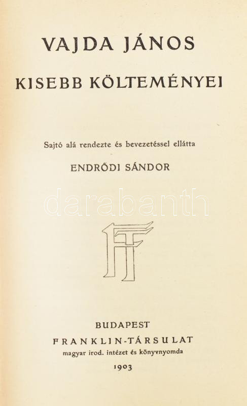 Vajda János kisebb költeményei. Sajtó alá rendezte és bevezetéssel ellátta: Endrődi Sándor. Magyar Remekírók 50. köt. Bp., 1903, Franklin-Társulat, 1 t. + 276 p. Kiadói gazdagon festett, aranyozott, szecessziós egészvászon-kötés, Leszik-kötés, a címkép kijár, egyébként jó állapotban.