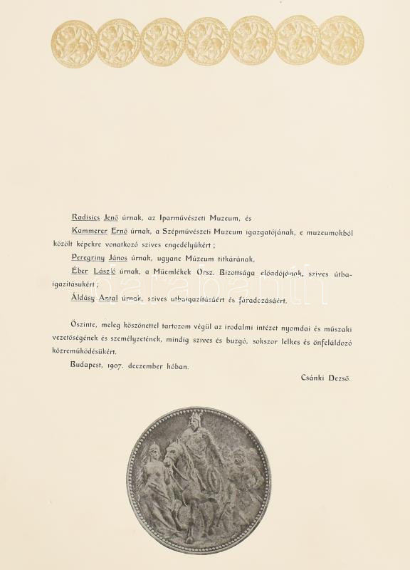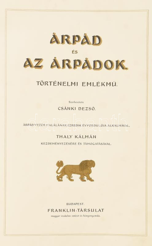 Csánki Dezső (szerk.): Árpád és az Árpádok. Történelmi emlékmű. Árpád vezér halálának ezredik évfordulója alkalmával, Thaly Kálmán kezdeményezésére és támogatásával. Bp. (1908), Franklin. XVII p.+2 sztl. lev.+396 p.+ 1 sztl. lev.+60 ((Lapszámozáson belül 19 (színes, feliratozott hártyapapírral); 16 (színes, feliratozott hártyapapírral); 22 (mell., facsimile, feliratozott hártyapapírral); + 1 térkép (színezett, kihajtható, mellette kihajtható térképvázlat); + 2 (genealogiai tábla, kihajtható)) t. Szövegközti, színes képekkel gazdagon illusztrált. Fejezetenként eltérő, díszesen keretezett lapokkal, színes iniciálékkal. Kiadói aranyozott egészbőr-kötéssel, aranyozott lapélekkel, kopott borítóval, sérült gerinccel, a címkép hiányzik, a plakett hiányzik és a címképpel helyettesítették.