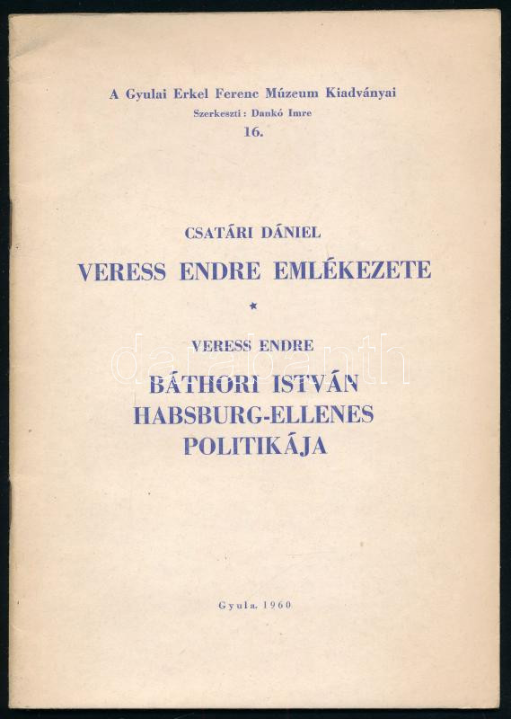 Csatári Dániel: Veress Endre emlékezete. / Veress Endre: Báthori István Habsburg ellenes politikája. Gyulai Erkel Ferenc Múzeum kiadványai 16. Gyula, 1960., Erkel Ferenc Múzeum. Kiadói papírkötés.