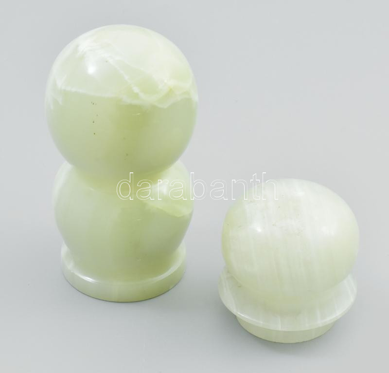 Leírás: 2 darab alabástrom asztaldísz, eredetileg art deco stílusú lámpatestek, kis kopással, m: 7-14 cm
