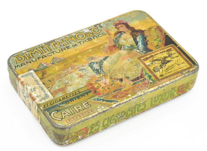 Leírás: Dimitrino festett fém reklámos cigarettás doboz, kopott 11x7x2 cm