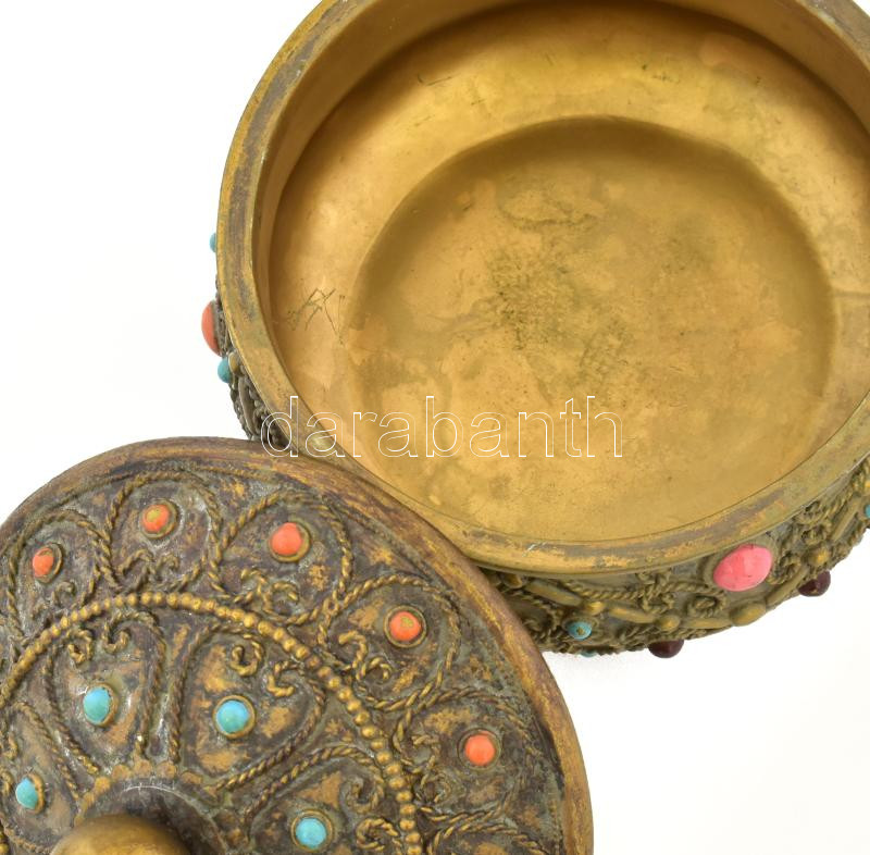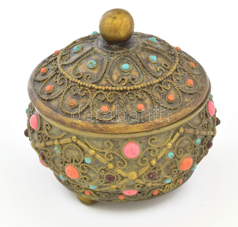 Leírás: Ékszerdoboz. Műgyanta-gipsz őrlemény, aranyozott, kis kövekkel, hibátlan d: 14 cm