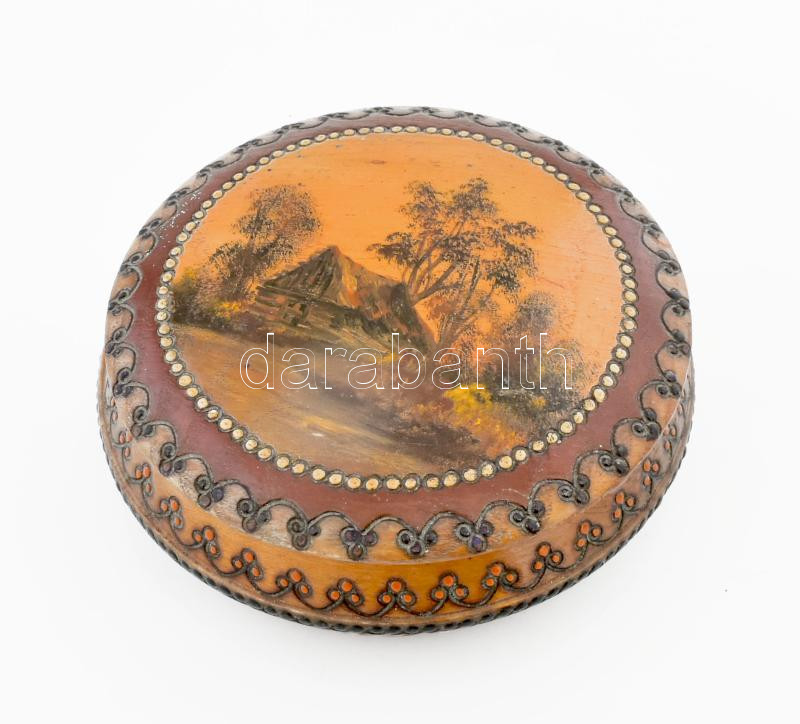 Leírás: Fa ládika, kézzel festett mintával. d: 14 cm