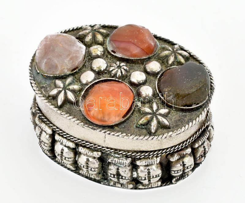 Leírás: Gyógyszeres doboz, fém, féldrágakövekkel 4,5 cm