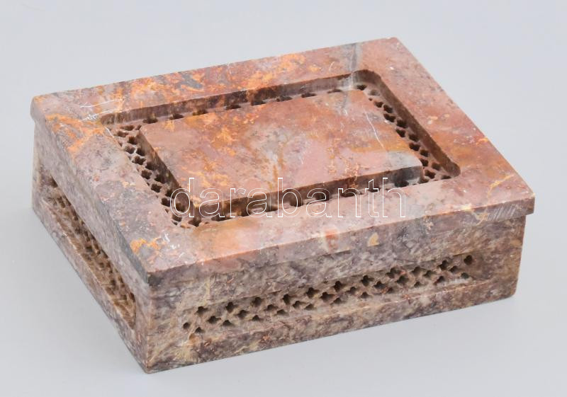 Leírás: Indiai áttört mintás zsírkő doboz, szép állapotban, 10x8x3,5 cm