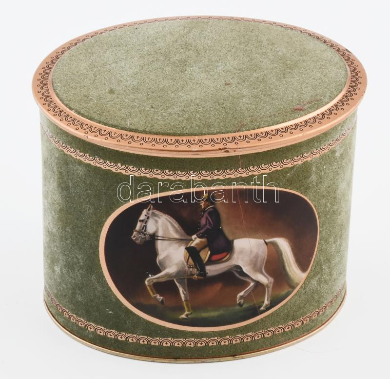 Leírás: MAx Herz fém kávés doboz, bársonyos borítással. Lovas jelenettel 16x13 cm