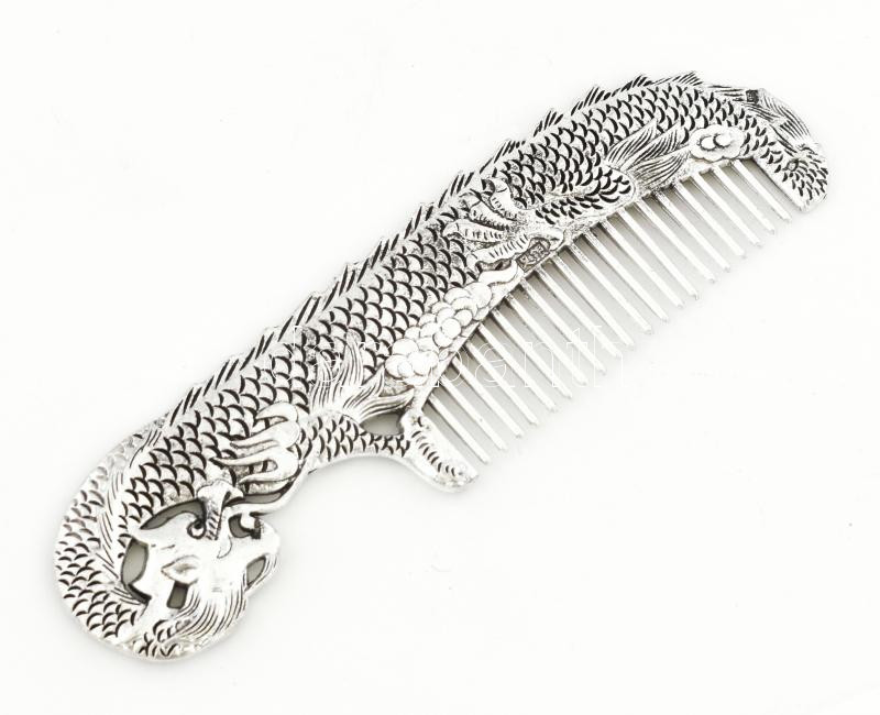 Leírás: Sárkány díszítményes kínai fém fésű, jelzéssel, hibátlan, h: 16,5 cm