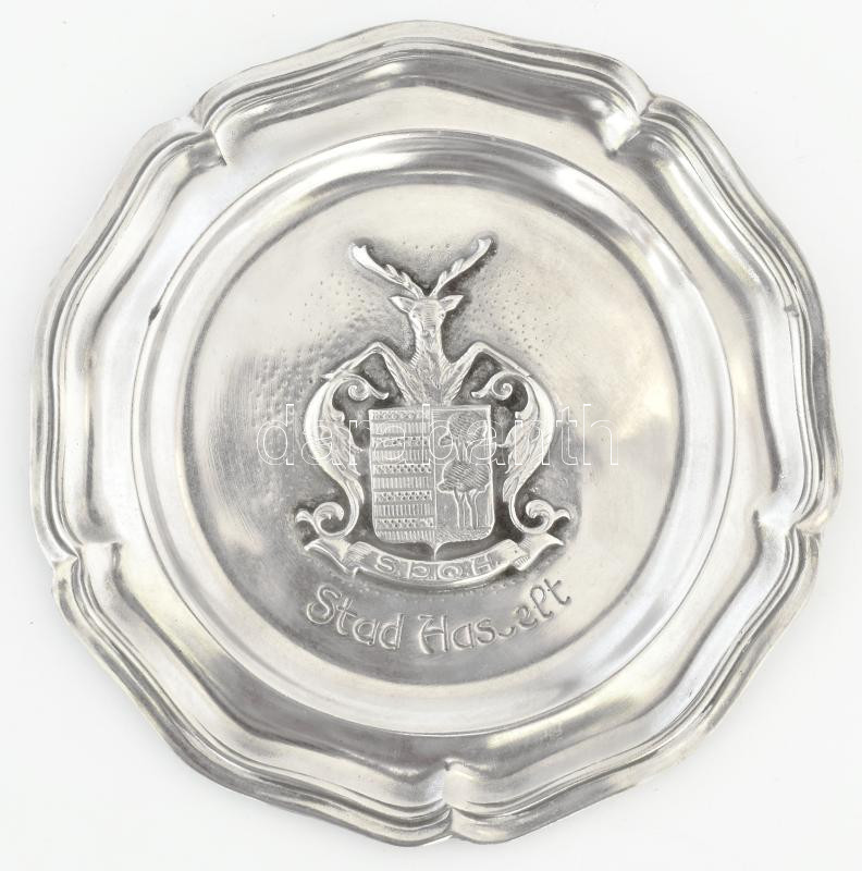 Leírás: Stad Hasselt belga városcímeres fali dísztál. Ón, jelzett, d: 18,5 cm