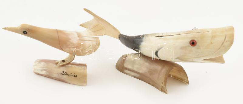 Leírás: Szaru hal és madár figura, kopással, h: 19-32 cm