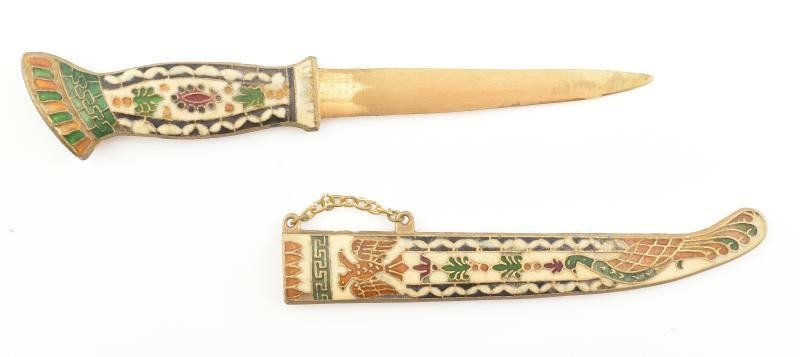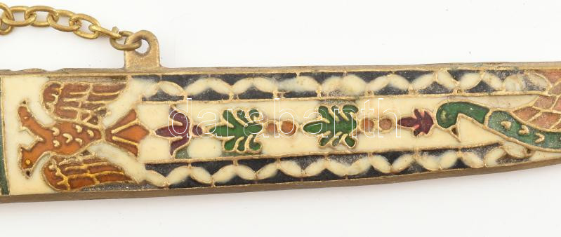 Leírás: Tűzzománc díszítéssel réz levélbontó tőr, kopásokkal, h: 27 cm