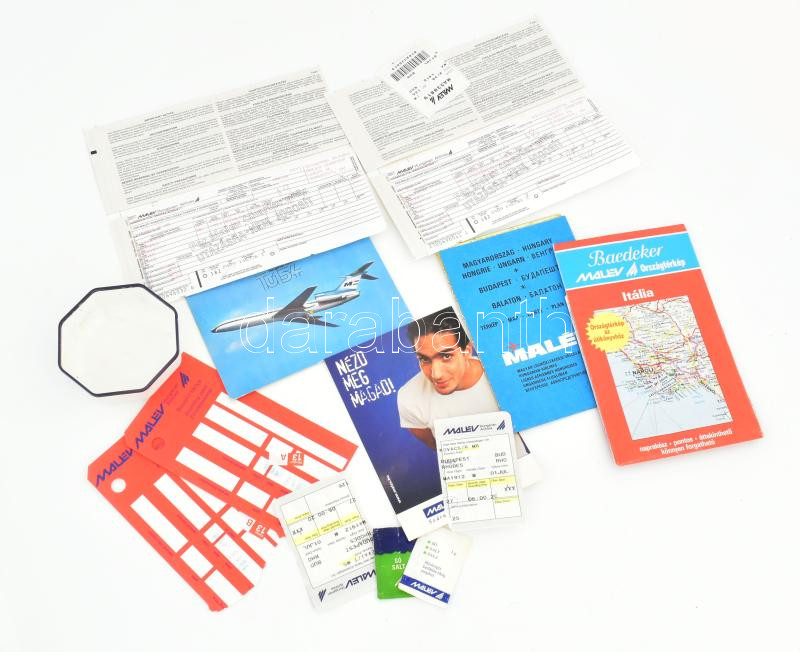 Leírás: Vegyes MALÉV tétel: repülőjegyek, térkép, tálka, stb.; össz. 9 db