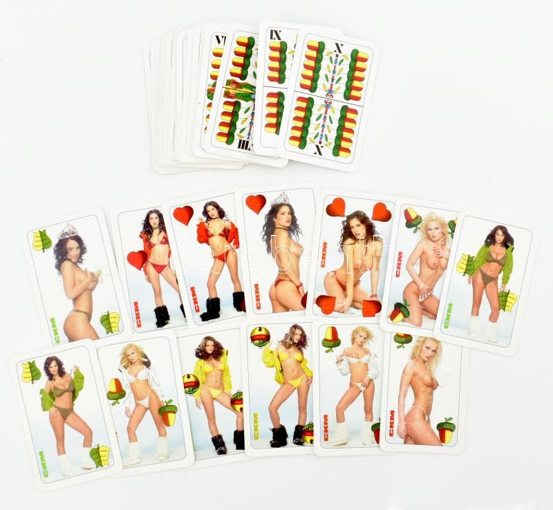 Erotikus magyarkártya pakli, 32+1 lap (komplett), néhány lapon kopásnyomokkal. (A pakli figurákat ábrázoló lapjai - össz. 16 db lap - erotikus fotókkal illusztráltak.)