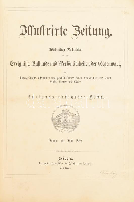 1879 Illustrirte Zeitung. Lipcse, 1879, Verlag der Expedition der Illustrirten Zeitung. 1879 jan-juniusig, fél évf. Német nyelven. Szegedi árvízről 19 metszet (3 kétoldalas, 1 térkép, 1 hirdetés) és írás. Korabeli aranyozott gerincű févászon kötésben, gerincen és borítón apró sérülésekkel, lapokon hajtásnyommal, máskülönben jó állapotban.
