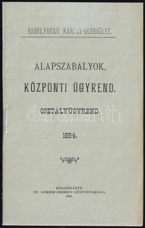 Leírás: 1894 Az Erdélyrészi Kárpát Egyesület alapszabálya. Központi ügyrend, osztályügyrend. Kolozsvár, 1896. Gombos Ferenc. 32p. szép állapotban