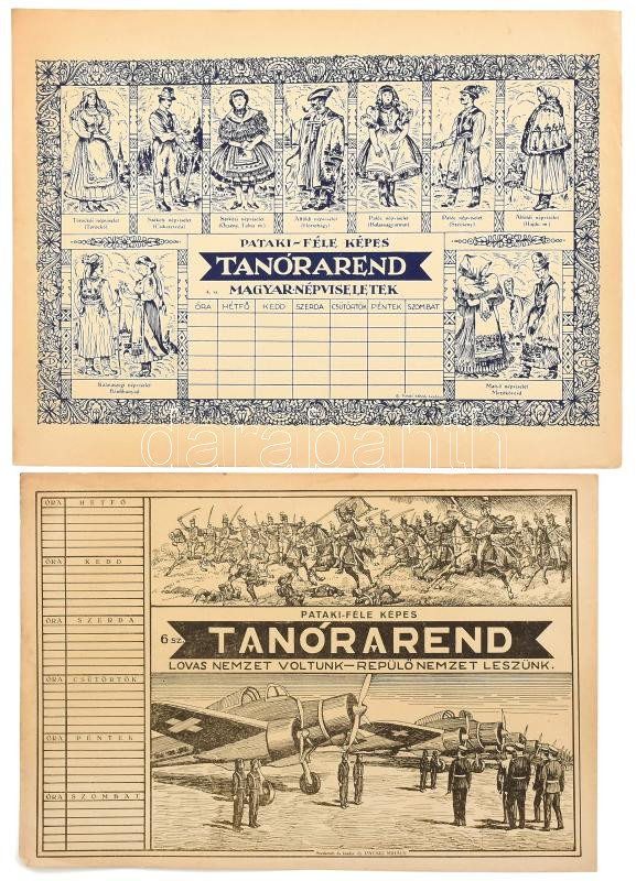 cca 1930-1940 Pataki-féle képes tanórarend, 2 db különböző (repülős, magyar népviseletek), kitöltetlen, minimális lapszéli sérüléssel, 29,5x20 cm és 31,5x23 cm