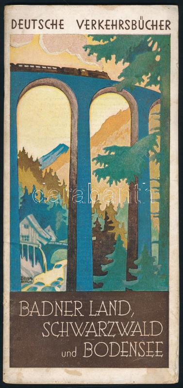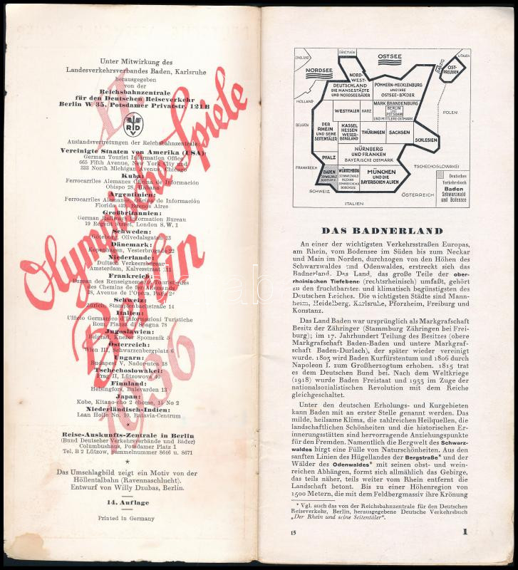 cca 1936 Badner Land, Schwarzwald und Bodensee / Baden, a Fekete-erdő és a Boden-tó, német idegenforgalmi ismertető prospektus, fekete-fehér fotókkal, egy kihajtható térképpel, (benne az 1936-s berlini olimpia hirdetése), 40 p.