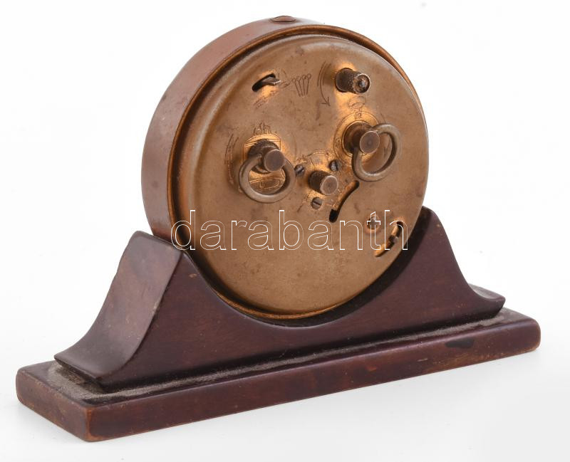 Leírás: Régi ébresztőóra fa alapon, réz test, működik, kézi felhúzós 12 cm