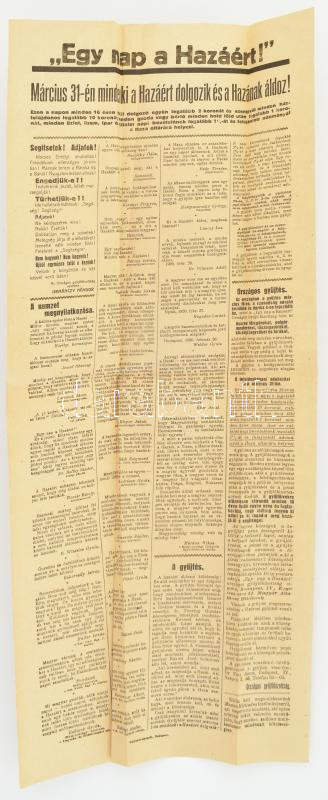 Leírás: cca 1930 Egy nap a Hazáért hazafias gyűjtőmozgalom irredenta plakát jó állapotban, hajtva 25x30 cm