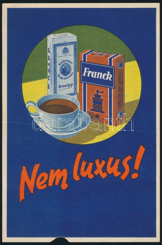 1936 "Nem luxus!", Franck kávé és Kneipp malátakávé, illusztrált, kéto... https://www.darabanth.com/hu/443-Gyorsarveres/443.0/Mutargy-papirregiseg-egyeb/Reklam~500025/1936-Nem-luxus-Franck-kave-es-Kneipp-malatakave-illusztralt-ketoldalas-reklamlap-alj~II2923551