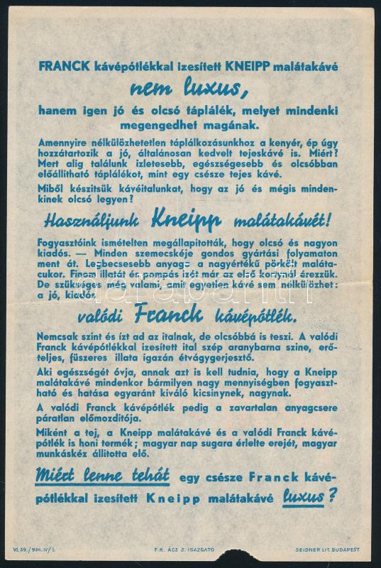 Leírás: 1936 "Nem luxus!", Franck kávé és Kneipp malátakávé, illusztrált, kétoldalas reklámlap, alján kis sérüléssel, 20x13 cm