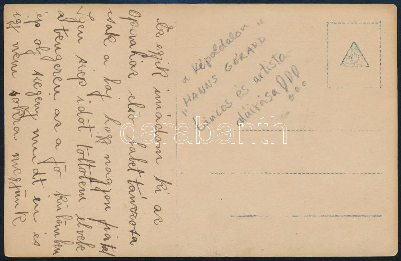 cca 1920-1930 Hanns Gérard (1897-1964) balett-táncos autográf aláírása őt ábrázoló fotólapon (a hátoldalon hozzá fűződő, érdekes korabeli magyar nyelvű feljegyzéssel), 13,5x8,5 cm