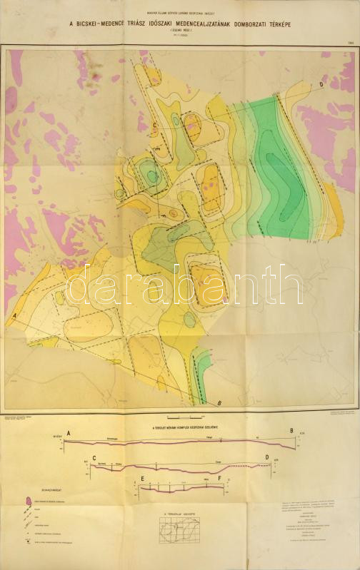 1966 A Bicskei-medence triász időszaki medencealjzatának domborzati térképe (északi rész). Szerk.: Szabadváry László. Nagyméretű térkép, 1 : 50.000, Magyar Állami Eötvös Loránd Geofizikai Intézet. Kis lapszéli szakadásokkal, vágott lapszélekkel, kissé koszos, 100x63 cm