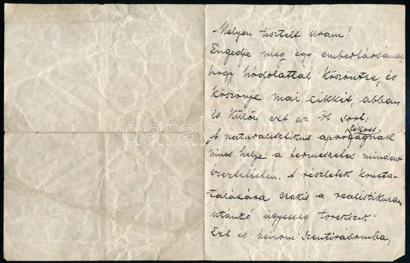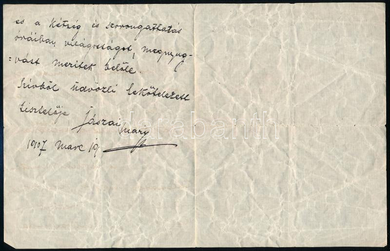 1907. márc.19. Jászai Mari (1850-1926) színésznő autográf sorai Gerő Ödön (1863-1939) műkritikus, szerkesztőnek, amelyben köszönettel reagál Gerő egy kritikájára: "(...) Engedje meg egy embertársának hogy hódolattal köszöntse, és köszönje mai cikkét, abban is külön ezt az öt sort: ' A naturalisztikus aprólékosságnak nincs helye a természetes mindent éreztetésben. A részletek konstatálására csakis a realistikusan utánzó ügyesség törekszik'. Ezt is beírom Szentírásomba (...)". Másfél beírt oldal, Jászai Mari autográf aláírásával.