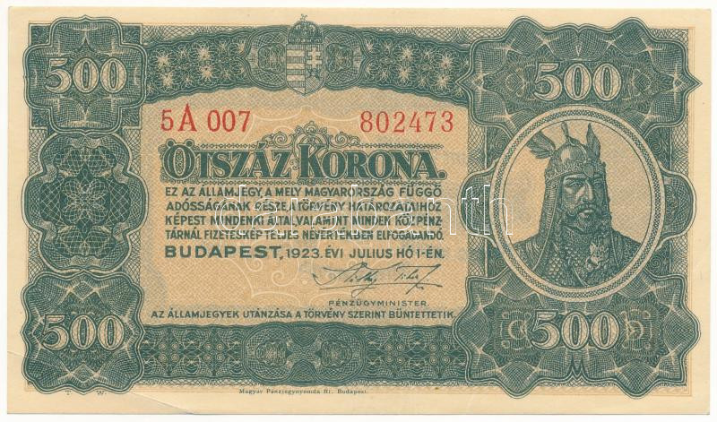 Leírás: 1923. 500K "5A 007 802473" "Magyar Pénzjegynyomda Rt. Budapest" nyomdahely jelöléssel T:VF Adamo K34