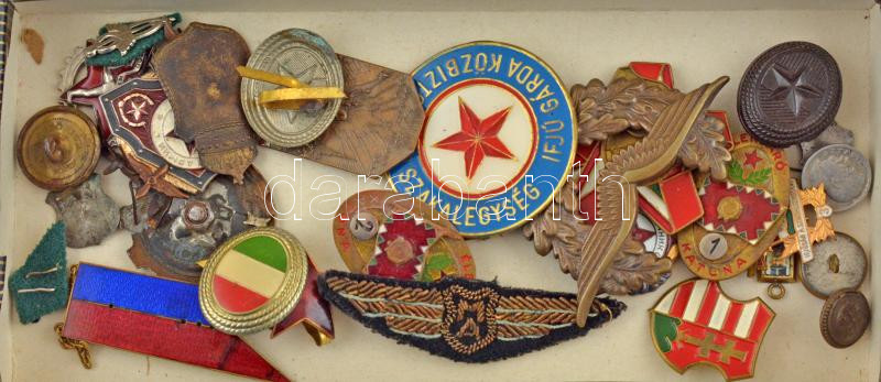 Leírás: Kis doboznyi vegyes, főleg magyar régi és szocialista jelvény, gomb, felvarró, közte főleg katonai téma T:vegyes