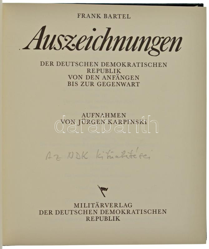 Frank Bartel: Auszeichnungen der Deutschen Demokratischen Republik von den anfängen bis zur gegenwart (A Német Demokratikus Köztársaság kitüntetései a kezdetektől napjainkig). Militärverlag der DDR, Berlin, 1979. Német nyelvű, az NDK kitüntetéseit bemutató könyv, gazdag illusztrációval. Használt, alapvetően jó állapotban, a gerincén egy nagyobb sérüléssel.