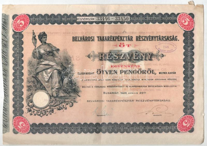 Budapest 1926. "Belvárosi Takarékpénztár Részvénytársaság" öt részvény... https://www.darabanth.com/hu/443-Gyorsarveres/443.0/Numizmatika/Reszvenyek-es-sorsjegyek~1500005/Budapest-1926-Belvarosi-Takarekpenztar-Reszvenytarsasag-ot-reszvenye-egyben-250P-rol-~II2920571