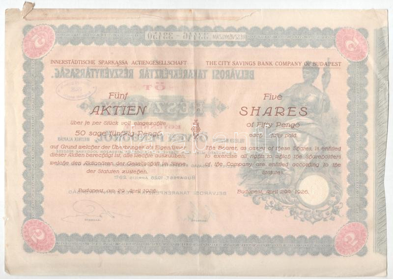 Leírás: Budapest 1926. "Belvárosi Takarékpénztár Részvénytársaság" öt részvénye egyben 250P-ről (2x), szárazpecséttel és szelvényekkel T:VF