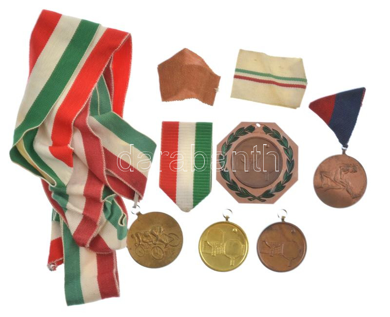 ~1954-1984. 5db-os vegyes bronz és aranyozott bronz sport díjérem tétel, közte kerékpár, asztalitenisz, birkózás díjérem füllel, hátoldalukon többségben gravírozott felirattal, 7db trikolor és egyéb mellszalaggal T:XF,VF