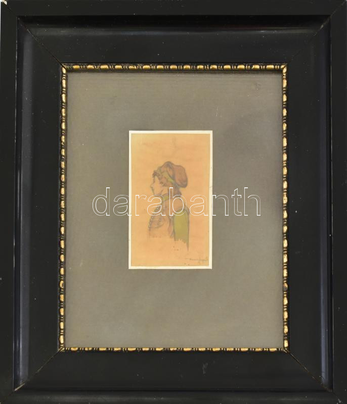 Leírás: Basch Árpád (1873-1944): Reneszánsz ifjú. Vegyes technika, papír (hullámos), jelzett, üvegezett fakeretben, 8x5 cm