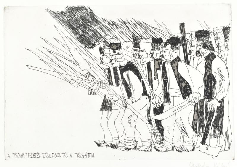 Leírás: Csohány Kámán (1925-1980): A tiszaháti felkelés. Zászlóbontás a tiszaháton. Rézkarc, papíron, kis foltok, 29x20 cm